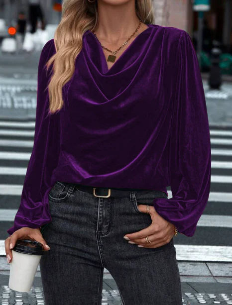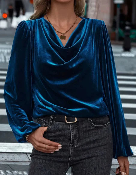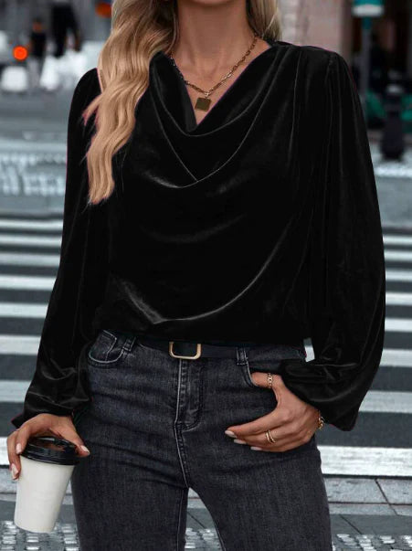 Ilyana – Aksamitna bluzka z długim rękawem i drapowanym kołnierzem